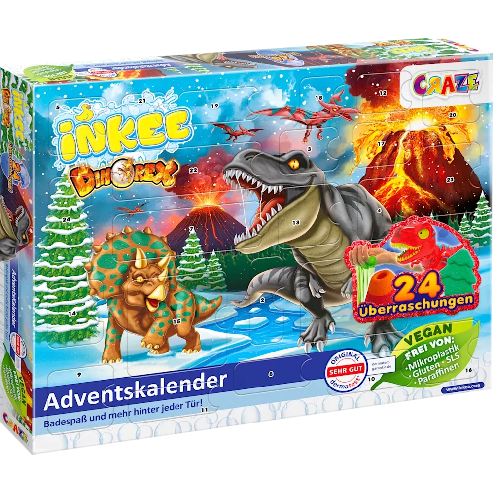 De Dinorex adventskalender van CRAZE verandert de periode voor Kerstmis in een spannende reis vol badplezier. Achter elk deurtje zitten kleurrijke badballen, knisperend badzout en een coole dinosaurustattoo die voor allerlei verrassingen zorgen. De veganistische inhoud is dermatologisch getest en dus ook geschikt voor de gevoelige kinderhuid. Met de fantasierijke badproducten wordt elke dag in december een klein avontuur in de badkamer. Deze adventskalender zal kleine dinosaurusfans in verrukking brengen en hun ogen laten oplichten tijdens de adventsperiode.