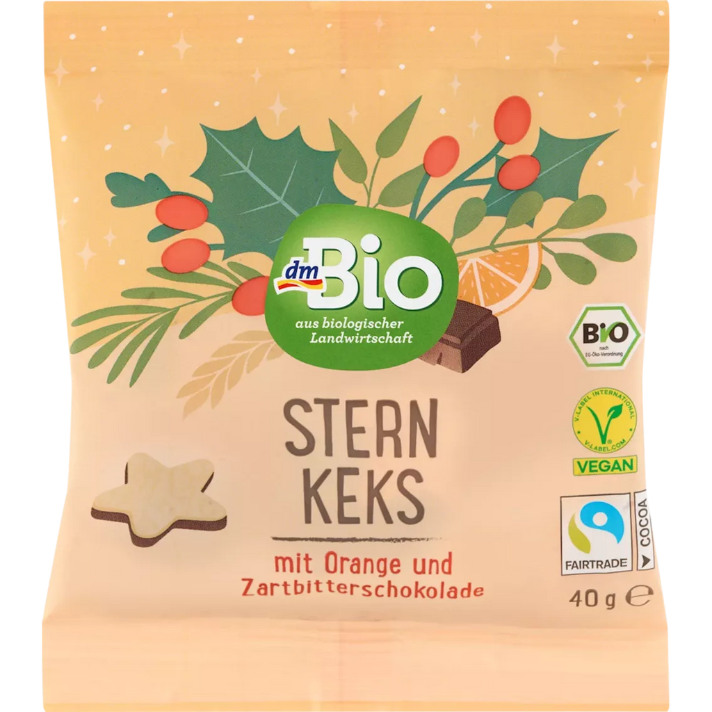 Vul je adventskalender zelf - met dmBio! De Orange Dark Chocolate Star Biscuit van dmBio combineert de subtiele bitterheid van pure chocolade met de fruitige frisheid van sinaasappel. De liefdevol ontworpen stervorm brengt kerstsfeer op het bord. In de praktische kleine verpakking is het ideaal als tussendoortje of als zoete metgezel onderweg. Een verwenmoment dat de adventstijd nog specialer maakt.