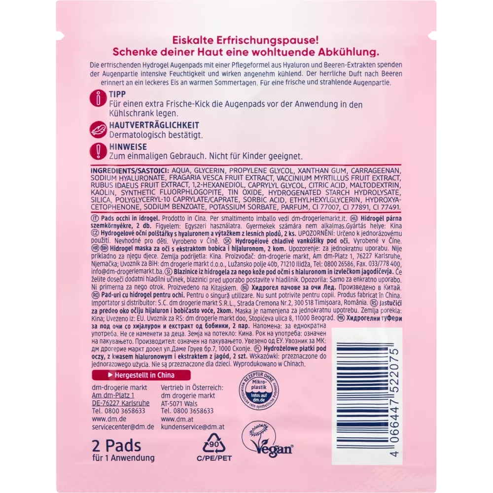 De verfrissende hydrogel oogpads met een formule van hyaluronzuur en bessenextracten uit Balea hydrateren de oogcontouren intensief en hebben een aangenaam verkoelend effect. De heerlijke geur van bessen doet denken aan een heerlijk ijsje op een warme zomerdag. Voor een frisse en stralende oogcontour.