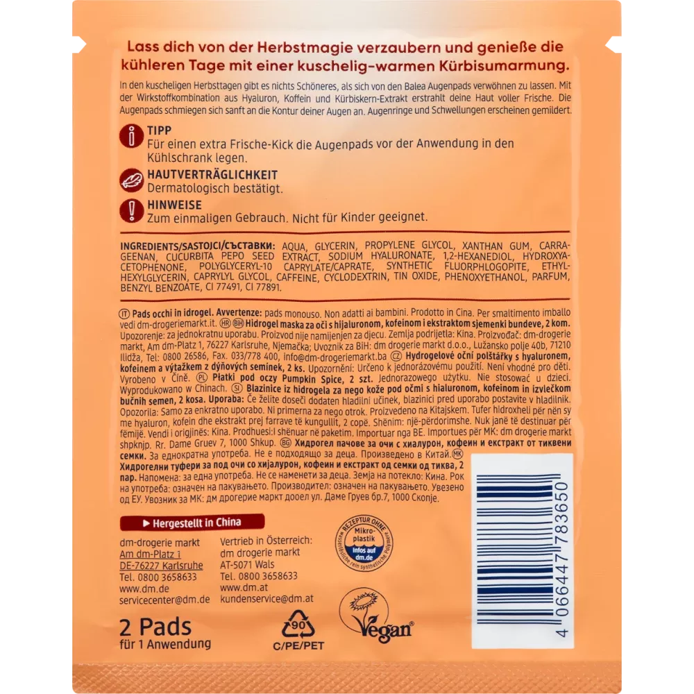 De Pumpkin Spice Latte hydrogel oogpads van Balea geven de huid een frisse gloed dankzij de actieve ingrediëntencombinatie van hyaluronzuur, cafeïne en pompoenpitextract. De pads vormen zich zachtjes naar de contouren van de ogen en kunnen donkere kringen en wallen verminderen. De pads hydrateren ook intensief. Samengesteld zonder microplastics en in water oplosbare, puur synthetische polymeren.