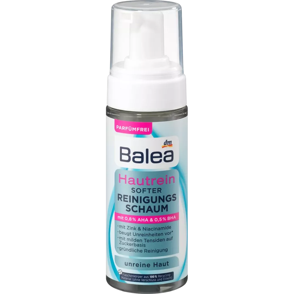 De Balea Skin Cleansing Foam reinigt en exfolieert de huid op milde wijze. Door de effectieve combinatie van AHA (melkzuur) en BHA (salicylzuur) worden dode huidcellen verwijderd en ziet de huid er stralender uit. De formule met zink en het trendy actieve ingrediënt niacinamide kan een regulerend effect hebben op het oliegehalte van de huid en de teint egaler doen lijken. Het actieve ingrediënt allantoïne staat erom bekend de huid te kalmeren en rondt de formule af. Huidverdraagzaamheid dermatologisch bevestigd.