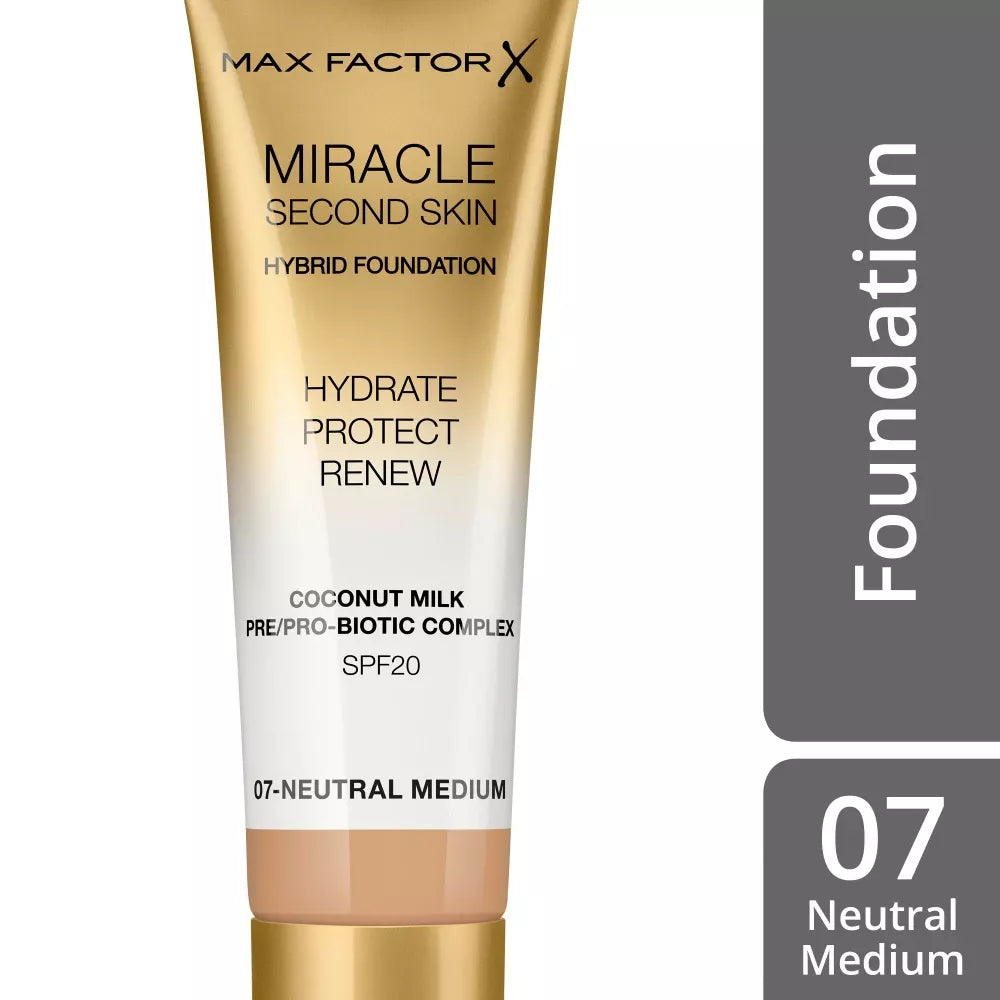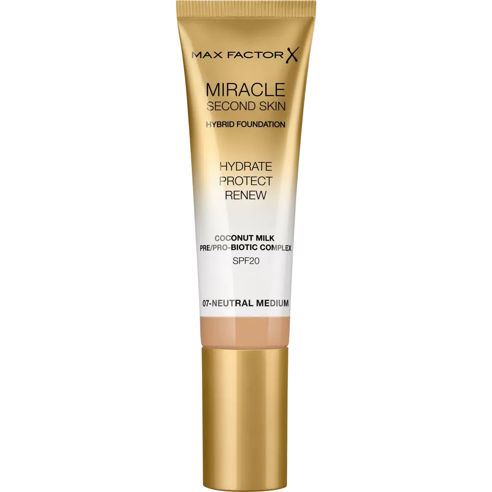 Dankzij de moderne formulering past Max Factor Miracle Second Skin Neutral Medium 07 precies bij de natuurlijke huidskleur en verfraait, revitaliseert, beschermt, versterkt en hydrateert de huid. Imperfecties worden verborgen, de teint wordt verfijnd en de huid wordt maximaal gevoed - voor een stralend mooie en natuurlijke teint. De unieke hybride foundation in de praktische en hygiënische pomptube is verkrijgbaar in in totaal 10 tinten.