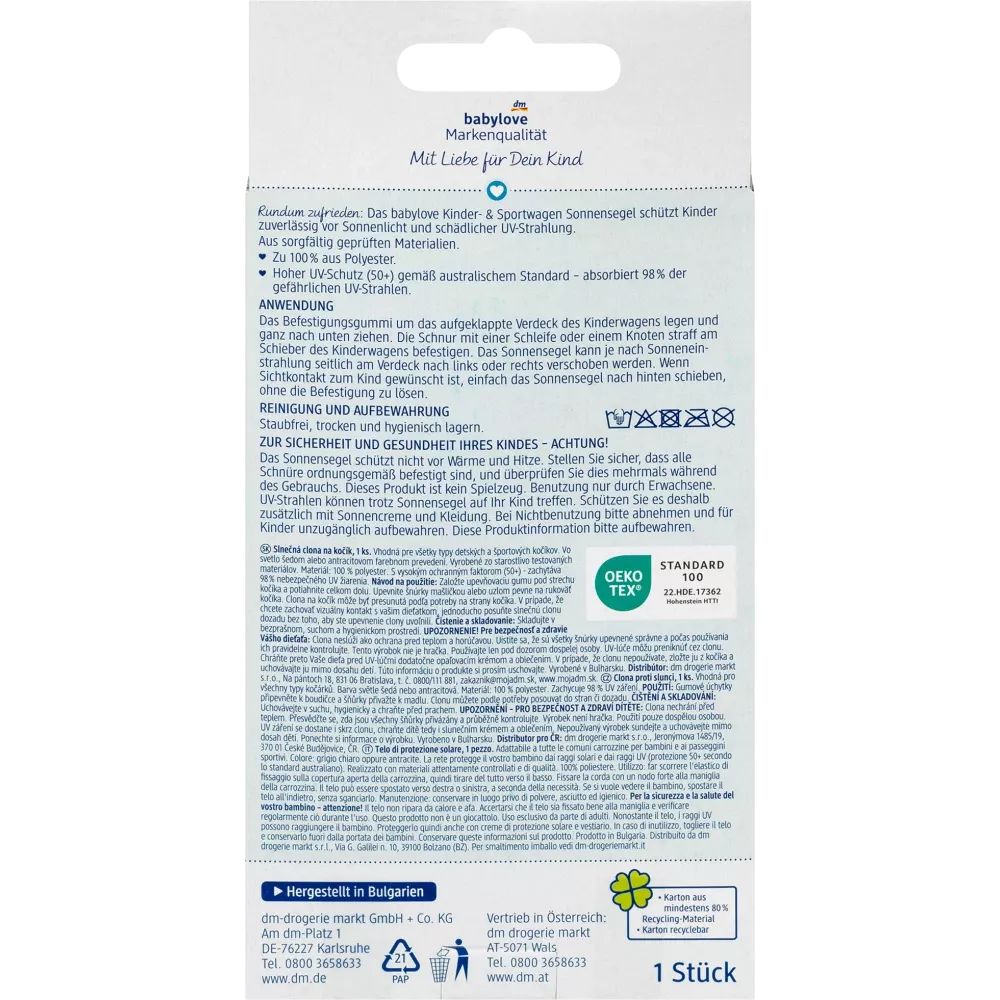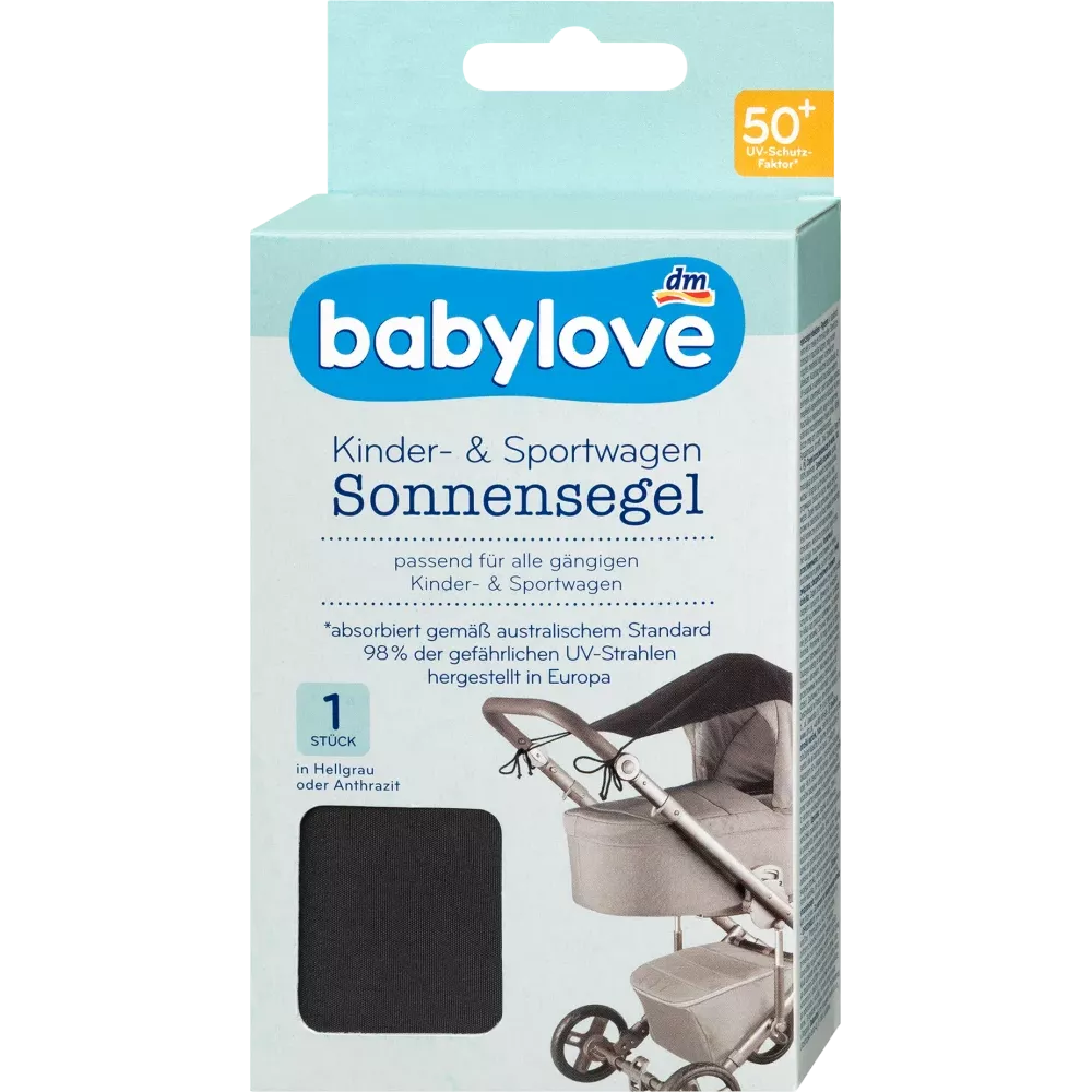 Het babylove ShineSafe zonnezeil in antraciet voor de kinderwagen biedt je kleintje aangename schaduw en bescherming tegen schadelijke UV-stralen. De jonge en tere babyhuid heeft nog geen eigen bescherming tegen UV-stralen ontwikkeld. Een paar minuten onbeschermd in de zon is al genoeg om de huid te verbranden. Zonnebrand is niet alleen heel onaangenaam en pijnlijk, maar verhoogt ook het risico op latere huidziekten. Daarom heeft de huid van je baby extra bescherming nodig.