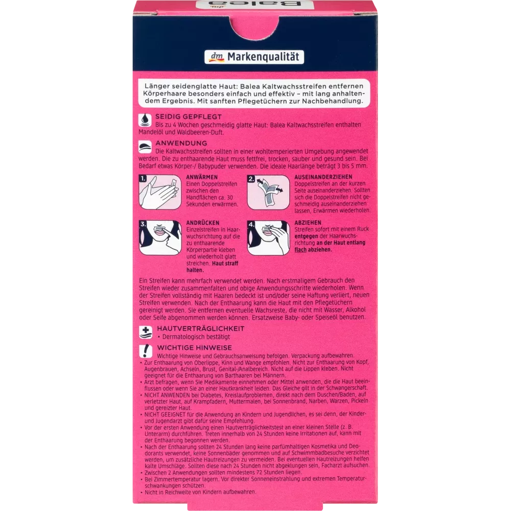 De Balea facial cold wax strips met amandelolie verwijderen lichaamshaar bijzonder gemakkelijk en effectief - met langdurige resultaten tot 4 weken. Met zachte verzorgingsdoekjes voor nazorg. Formulering zonder microplastics en in water oplosbare zuiver synthetische polymeren.