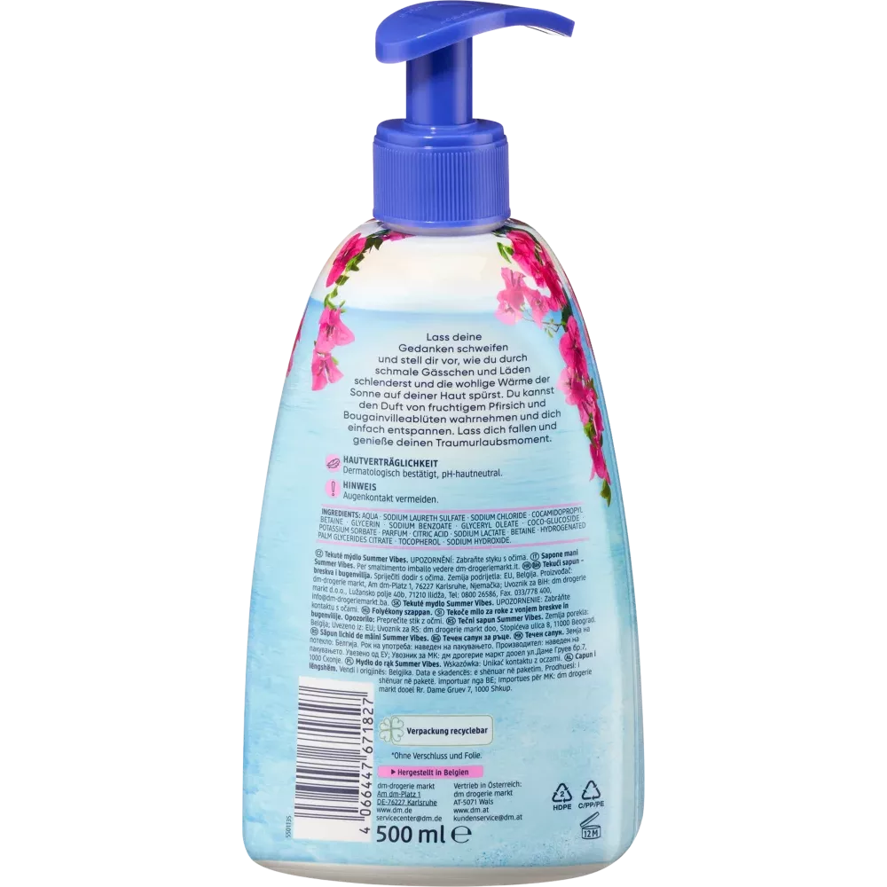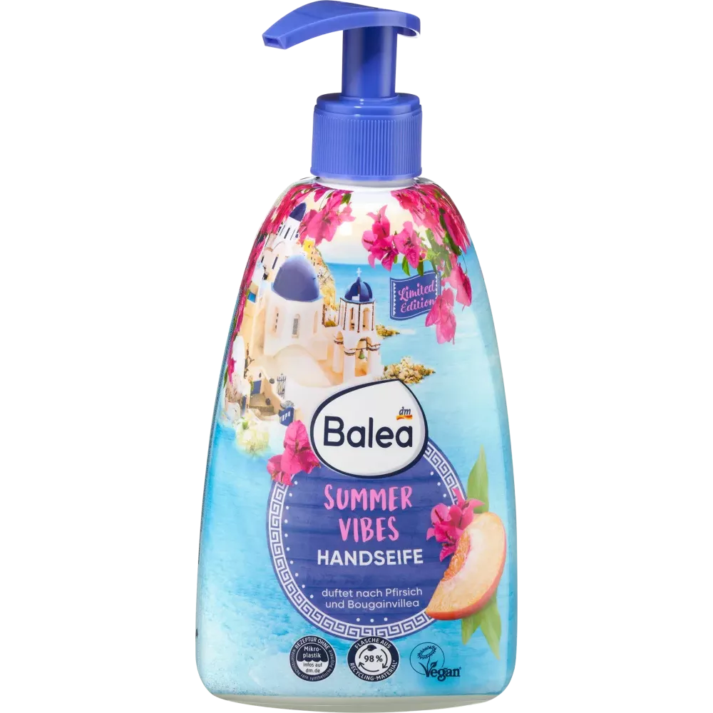 De Balea Summer crèmezeep heeft een frisse, fruitige geur van perzik en bougainville en behoudt de natuurlijke vochtbalans van de huid. De Moisture Care formule helpt beschermen tegen uitdroging. Samengesteld zonder microplastics en in water oplosbare, puur synthetische polymeren.