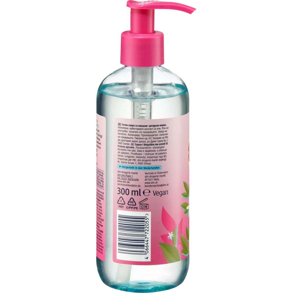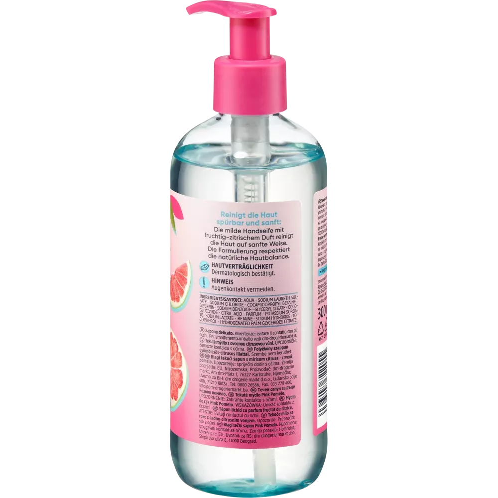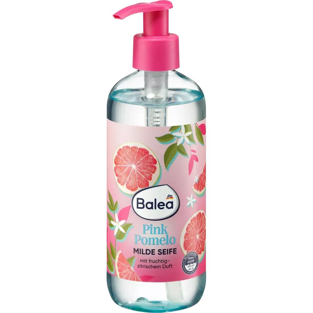 De Balea Mild Soap Pink Pomelo met grapefruitextract reinigt de huid merkbaar en mild. Met een fruitige, citrusachtige geur. Samengesteld zonder microplastics en in water oplosbare, puur synthetische polymeren.