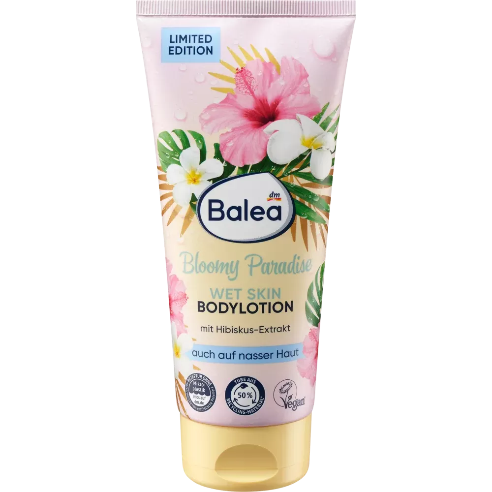 Le lait corporel Bloomy Paradise de Balea pour peau humide séduit par son parfum estival et exotique et son extrait d'hibiscus, laissant la peau merveilleusement douce. Ce soin intensif pénètre très rapidement sur peau humide. Formulé sans microplastiques ni polymères hydrosolubles 100 % synthétiques.