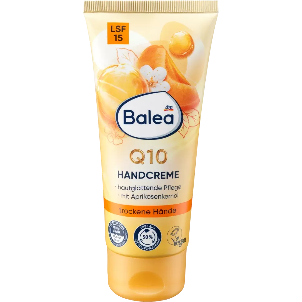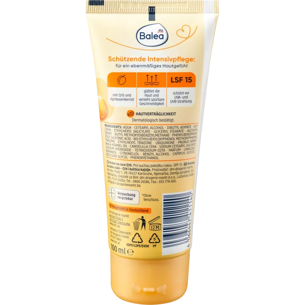 La crème mains Balea Q10 à l'huile de noyau d'abricot et SPF 15 est idéale pour les mains sèches. Ce soin protecteur intensif lisse la peau et la rend visiblement plus souple, tandis que son SPF 15 la protège des rayons UVA et UVB. Formulé sans microplastiques ni polymères hydrosolubles 100 % synthétiques.