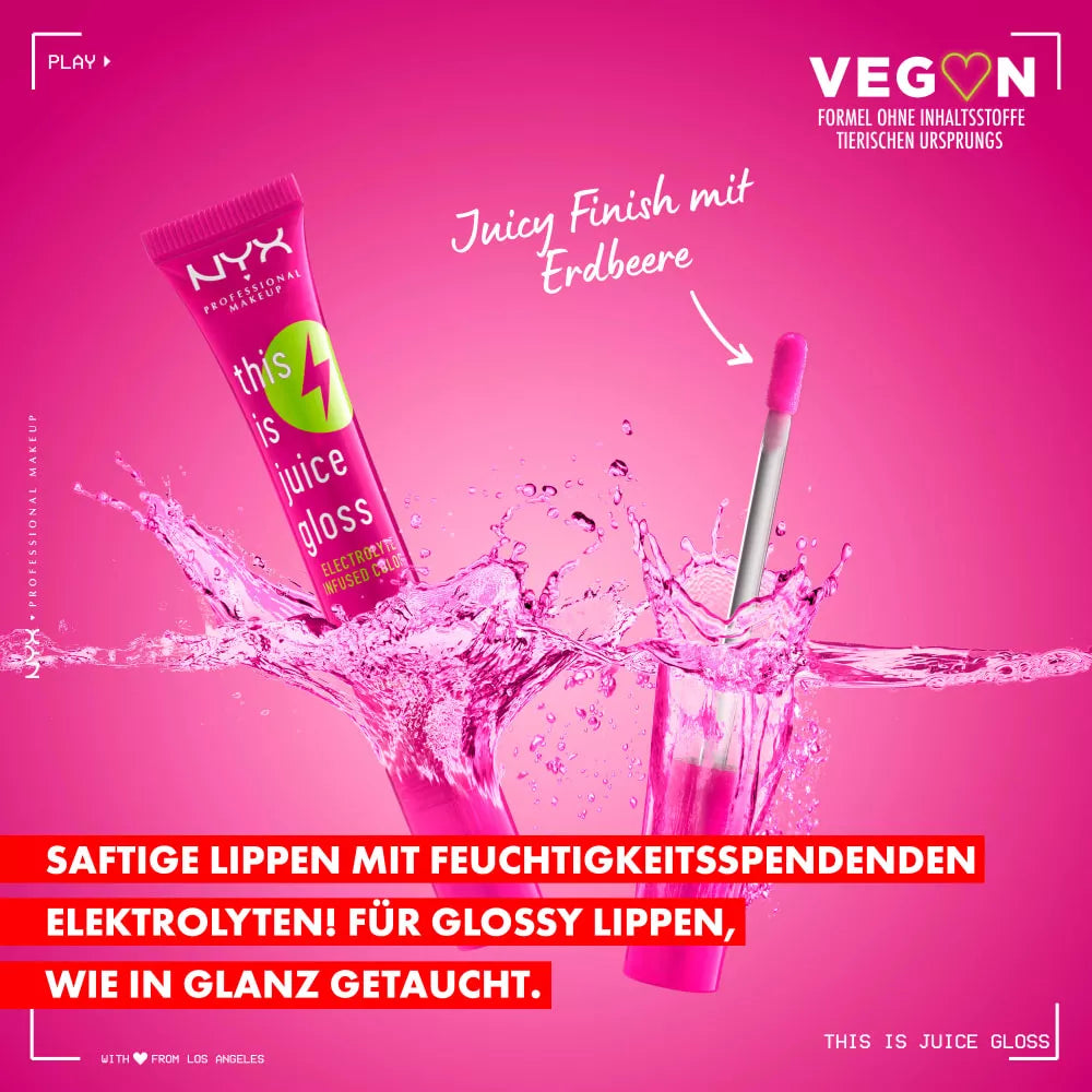 Envie de lèvres pulpeuses et magnifiques ? Le gloss This Is Juice Gloss de NYX Professional Makeup est le choix idéal. Il sublime vos lèvres grâce à la technologie Strawberry Flex et leur confère un fini scintillant pour des lèvres pulpeuses et spectaculaires. Intensément nourries grâce aux précieuses huiles de superfruits, elles sont hydratées grâce aux électrolytes. Enfin, ce gloss dévoile un parfum fruité rappelant les bars à jus branchés de Los Angeles.
