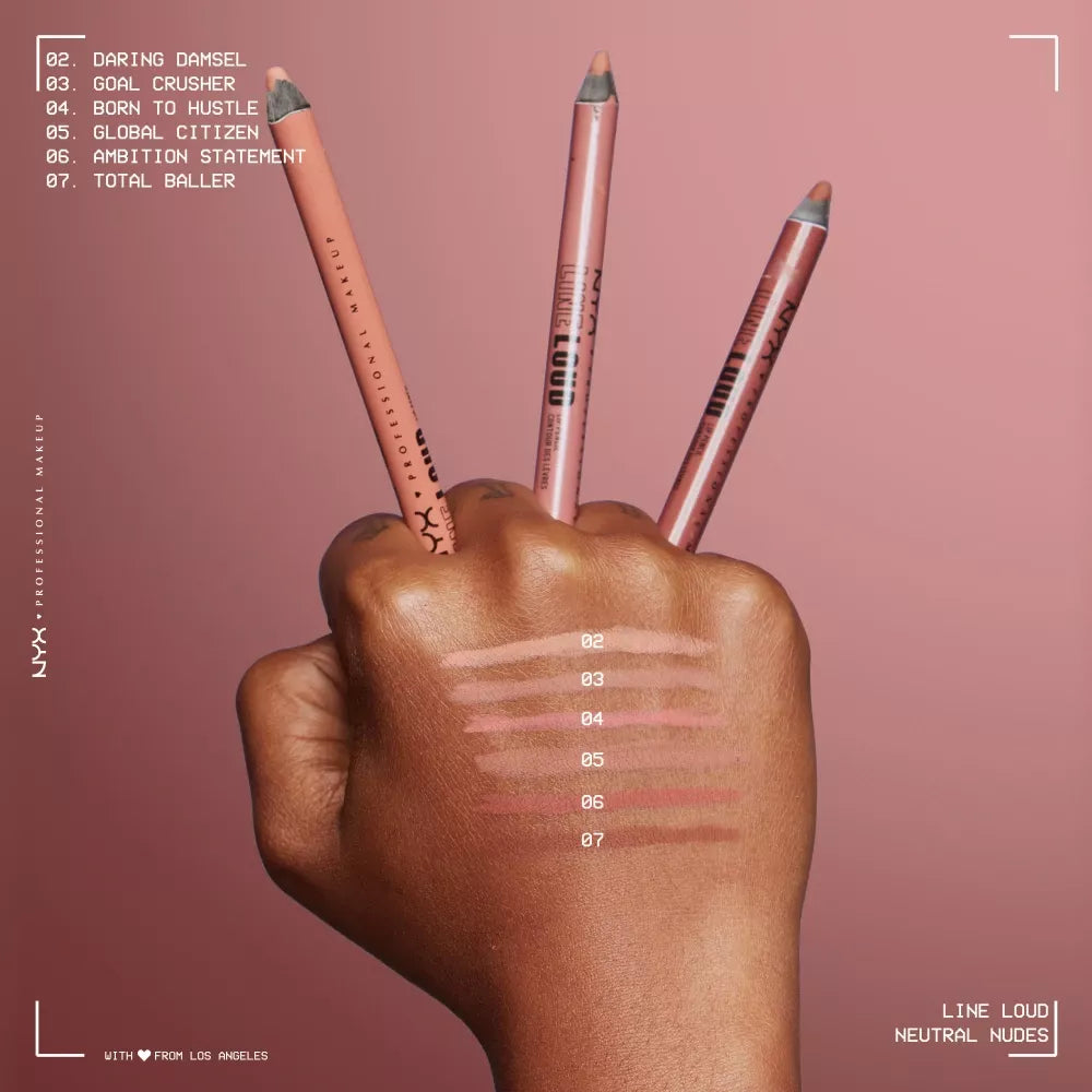 Le crayon à lèvres Loud Ambition Statement 06 de NYX Professional Makeup Line est un crayon longue tenue qui tient jusqu'à 24 heures. Il laisse un fini mat et peut être porté seul ou avec un rouge à lèvres.