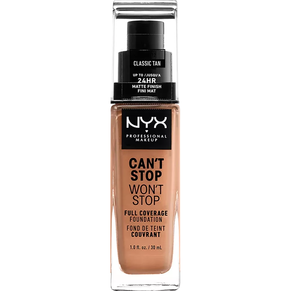 Le fond de teint 24 heures Can't Stop Won't Stop de NYX PROFESSIONAL MAKEUP, teinte Classic Tan 12, est léger, waterproof et hautement pigmenté. Il convient à tous les types de peau.