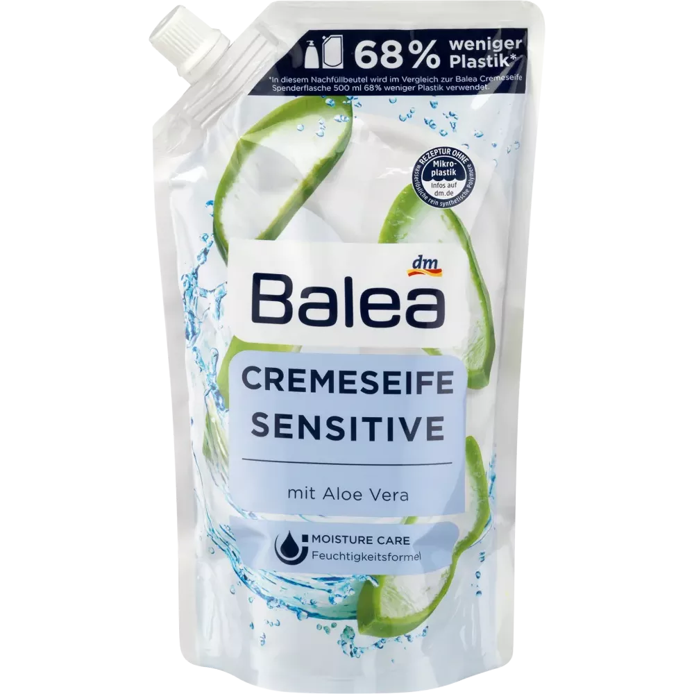 Le savon crème Balea Sensitive nettoie vos mains en douceur et leur apporte un soin remarquable au quotidien. Ce savon liquide à l'aloe vera préserve l'équilibre hydrique naturel de votre peau grâce à sa formule nourrissante et à ses ingrédients hydratants. De plus, son doux parfum vous enchantera. Sa formule est totalement exempte de microplastiques et de polymères hydrosolubles purement synthétiques.