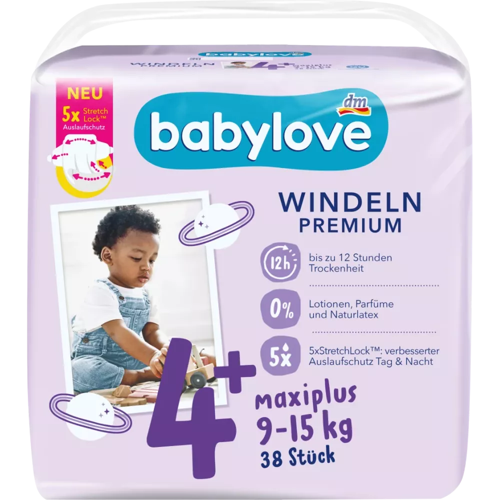 Couches babylove Premium taille 4+, Maxiplus, 9-15 kg, 38 pièces.