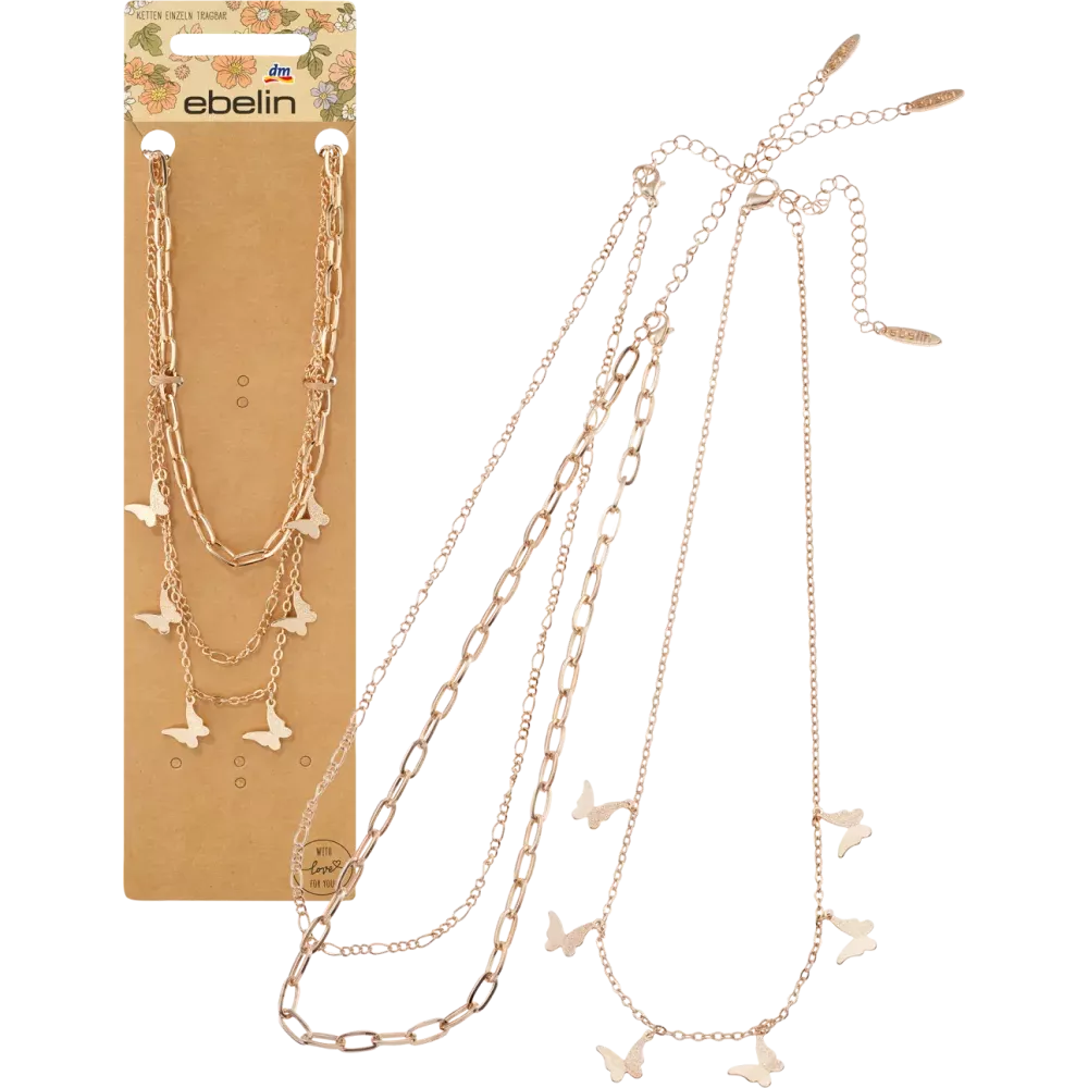 Collier ebelin aspect doré avec pendentifs papillon, 3 pièces.