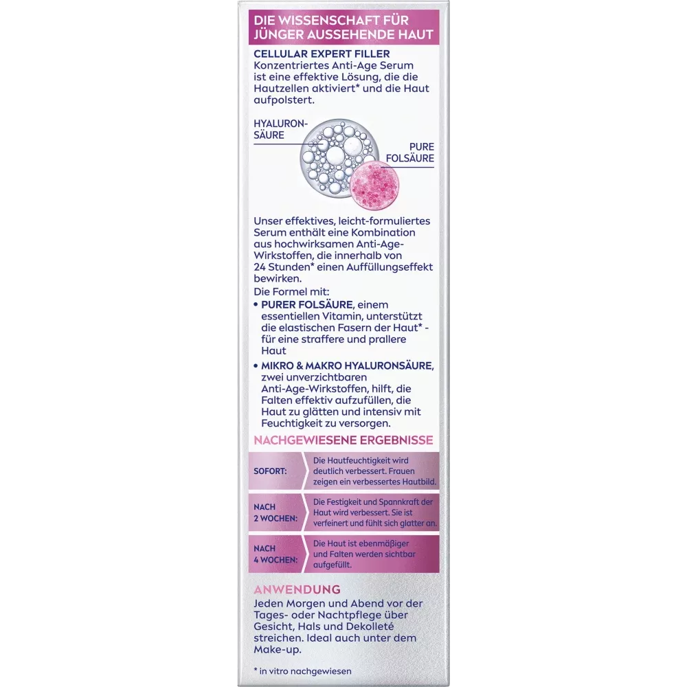 Le Sérum Anti-Âge Concentré NIVEA Cellular Expert Filler, à la texture légère et efficace, associe des ingrédients anti-âge hautement efficaces pour un effet boostant en 24 heures. Sa formule, enrichie en acide folique pur, une vitamine essentielle, renforce les fibres élastiques de la peau pour une peau plus ferme et plus rebondie. Le micro et le macro-acide hyaluronique, deux ingrédients anti-âge essentiels, comblent efficacement les rides, lissent la peau et l'hydratent intensément. Avec 50 % d'acide hyaluronique en plus que le Soin de Jour NIVEA Cellular, il offre un effet anti-âge intense.