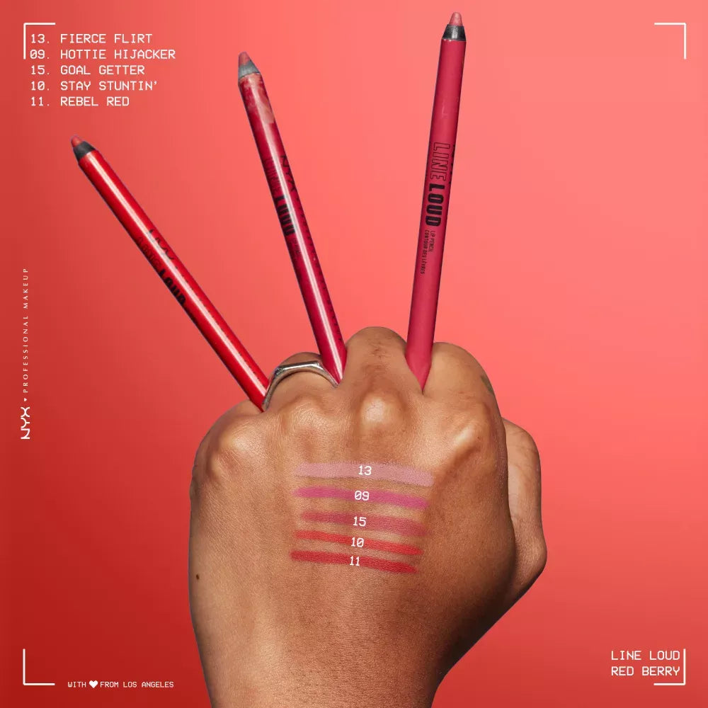 Le crayon à lèvres Line Loud Rebel Red 11 de NYX Professional Makeup est un crayon longue tenue qui tient jusqu'à 24 heures. Il laisse un fini mat et peut être porté seul ou avec un rouge à lèvres.