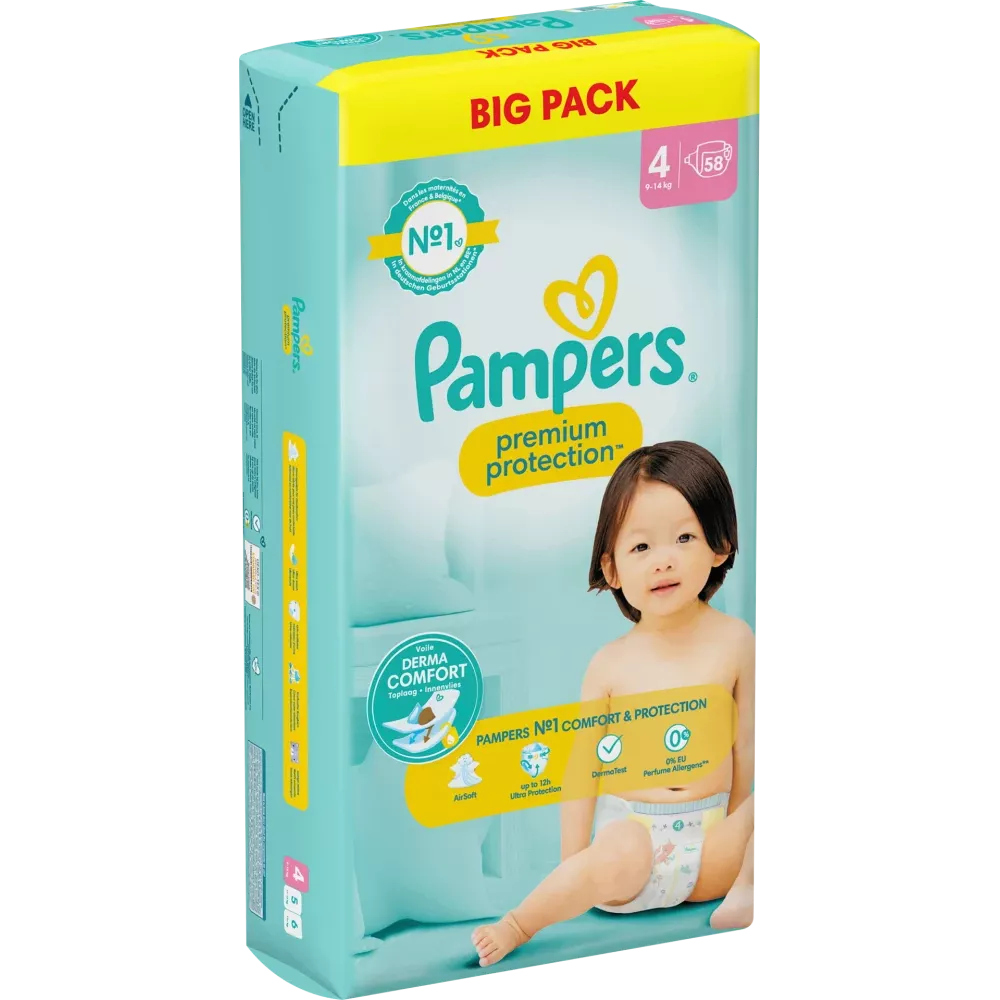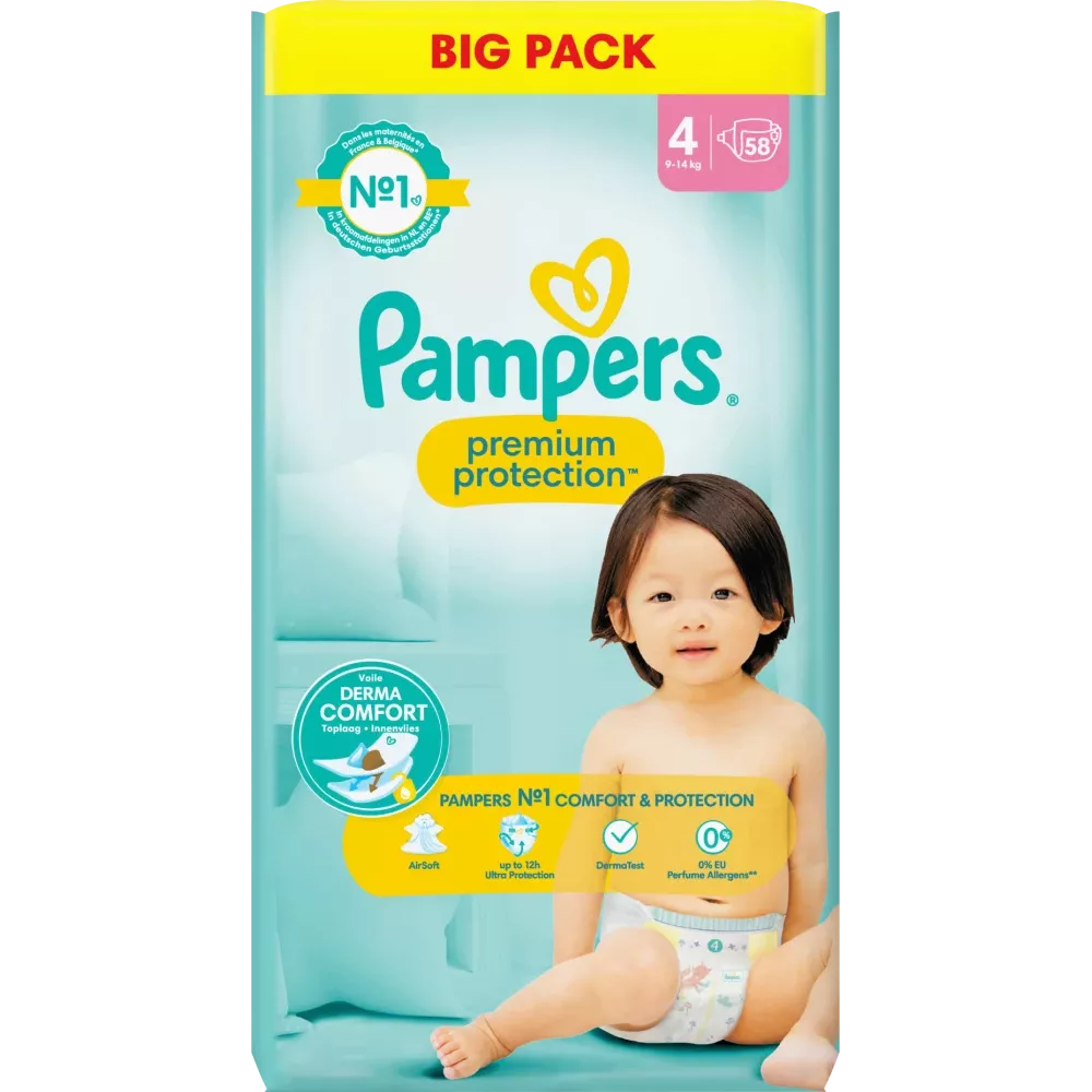Couches Pampers Premium Protection taille 4 Maxi (9-14 kg), vrac, 58 pièces.